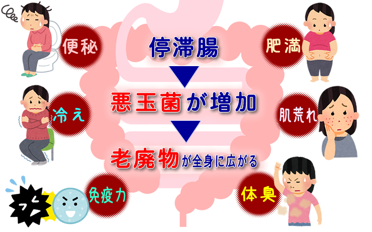 腸内に便がたまっている状態が続くと、腸の中で便が腐敗し有害物質やガスが発生し、有害物質は腸壁から吸収され血液にのって体中を巡ることになります。